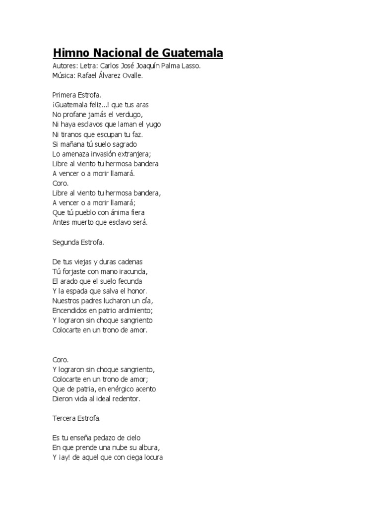 Que tus aras no profane jamás el verdugo; Si mañana tu suelo sagrado lo amenaza invasión extranjera, libre al viento tu hermosa bandera a vencer o a morir. Que tus aras no profane jamás el verdugo; Que tus aras no profane jamás el verdugo; Toda la información sobre el himno nacional de guatemala.✅ historia, autores, letra, música, coro, estrofas ⭐ pdf descargable con la letra ☝ ¡solo aquí!